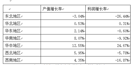 在7个地区内,只有华中地区和华北地区的产值及利润增长率为正向增长,华中地区增幅最大,分别为12.55%,24.67%。其余5个地区的利润增长率相较于产值增长率而言都出现了不同程度的下滑趋势。