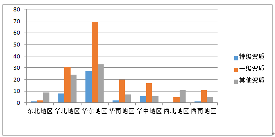 拥有特级及一级资质的企业则大部分分布在华北、华东地区。其中,华东地区的特级、一级资质企业最多,特级企业达到27家,一级企业达到69家,拥有其他资质等级企业数量也达到了33家。而东北、西北地区的特级及一级资质企业数量最少。