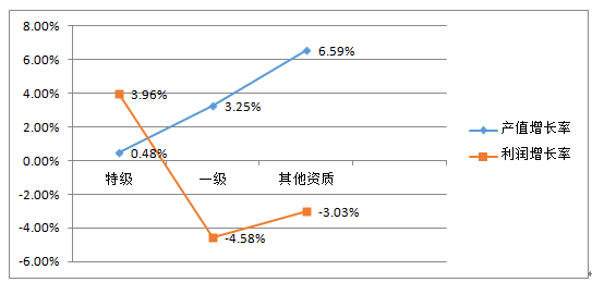 通过计算,得出不同资质企业的产值增长率和利润增长率(图5),可以看出,特级资质企业的产值和利润都呈现出正向增长,虽然产值增长率并不高,仅为0.48%,但利润则同比增长了3.94个百分点。一级资质企业和其他资质企业虽然产值与去年同期相比仍在在增加,尤其其他资质企业,产值同比增长6.59个百分点,是所得利润却大幅度下降。新常态下,不断的扩充产值并没有给企业带来丰厚的利润回报。