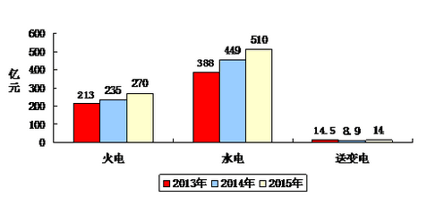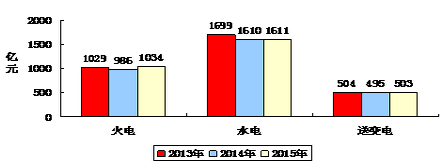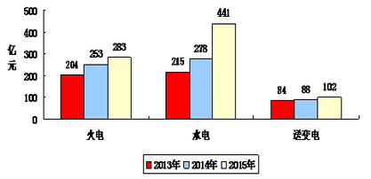 2015年,行业完成总营业收入3148亿元,同比降低1.84%。水电施工企业2015年总营业收入1611亿元,同比持平;火电施工企业2015年总营业收入1034亿元,同比增长4.87%;送变电施工企业2015年总营业收入503亿元,同比增长1.62%。