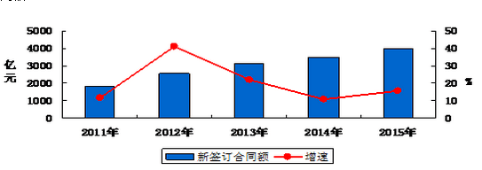 2015年,施工企业合同存量8411亿元,其中本年新签4008亿元,同比分别增长6.32%和15.50%,其中:水电施工企业合同存量5352亿元,其中本年新签2362亿元;火电施工企业合同存量2212亿元,其中本年新签1149亿元;送变电施工企业合同存量847亿元,其中本年新签497亿元。