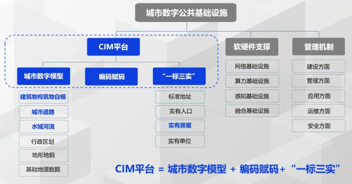 城市数字公共基础设施是数字孪生城市公共性、集约性基础设施,其核心是以城市数字模型为基座,对建筑物、构筑物等进行编码赋码,集成“一标三实”(标准地址、实有人口、实有房屋和实有单位)数据,依托数字基础设施,打造数据统一管理、系统统一融合、服务统一发布的CIM平台。