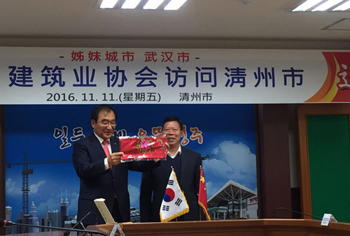 此次考察得到了清州市政府的高度重视,市长李承勋率市经济投资局局长申东吾等相关政府部门人员为考察团举行了隆重的接待礼仪。李承勋市长说,武汉市是中国的中心城市、清州市是韩国的中心城市,两市在2000年已结为姊妹友好城市,双方在经济、文化、教育、商务等多方面开展了实际性交流。2015年他和武汉市王立副市长在武汉香格里拉酒店亲自见证了武汉建筑业协会李淼磊副会长与忠清北道建设协会李善雨会长签订了合作备忘录。他希望在两个协会的引领下,进一步推动两城市间建筑行业的合作与交流。协会副秘书长李红青对清州市政府的热情接待表达了诚挚的谢意。对再次见到李承勋市长表达了亲切之意,对韩国优美的自然风光、悠久的人文历史和深厚的文化底蕴给予了高度赞誉。他希望以此次学习考察为契机,积极推进两个城市在建筑业的合作。仪式上双方互赠礼品并合影留恋,以此祝愿两个城市、两个协会友谊长存。