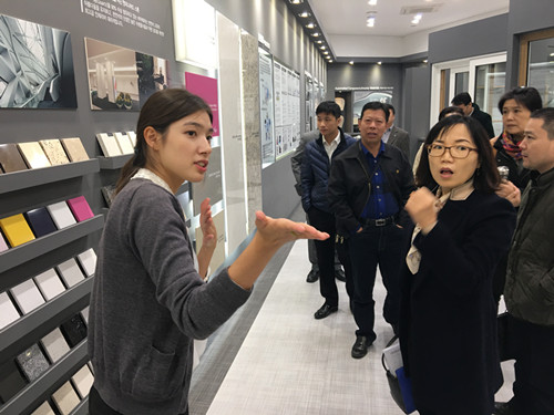 10日,考察团在忠清北道协会事务处金载甲处长、崔荣根室长等人的陪同下,参观了LG韩新工营商住楼项目。考察团人员对装配式轻质隔墙、内墙保温、冷热桥处理、定型模板施工、外墙面凹槽预留等工艺进行了详细了解,并先后观摩了结构层、半装修层及成品层的施工效果。大家对现场的施工质量、成品保护、安全防护、设备管理、现场文明施工、防噪音围墙等留下了深刻印象。随后考察团在LG Hansys 人事部长金丙秀的带领下参观了玉山工厂的环保PVC地板、PF保温隔热板、人造大理石的生产流水线,了解其施工工艺。大家通过现场观看PF隔热板的耐火试验,充分了解了PF板的隔热耐火效果以及PF板与国内常用的EPS、XPS板的性能差异。湖北邱氏节能建材高新技术股份有限公司总经理邓在洲在微信中这样描述LG生产工厂“参观过国内很多建筑材料大厂,相比而言反差太大”。