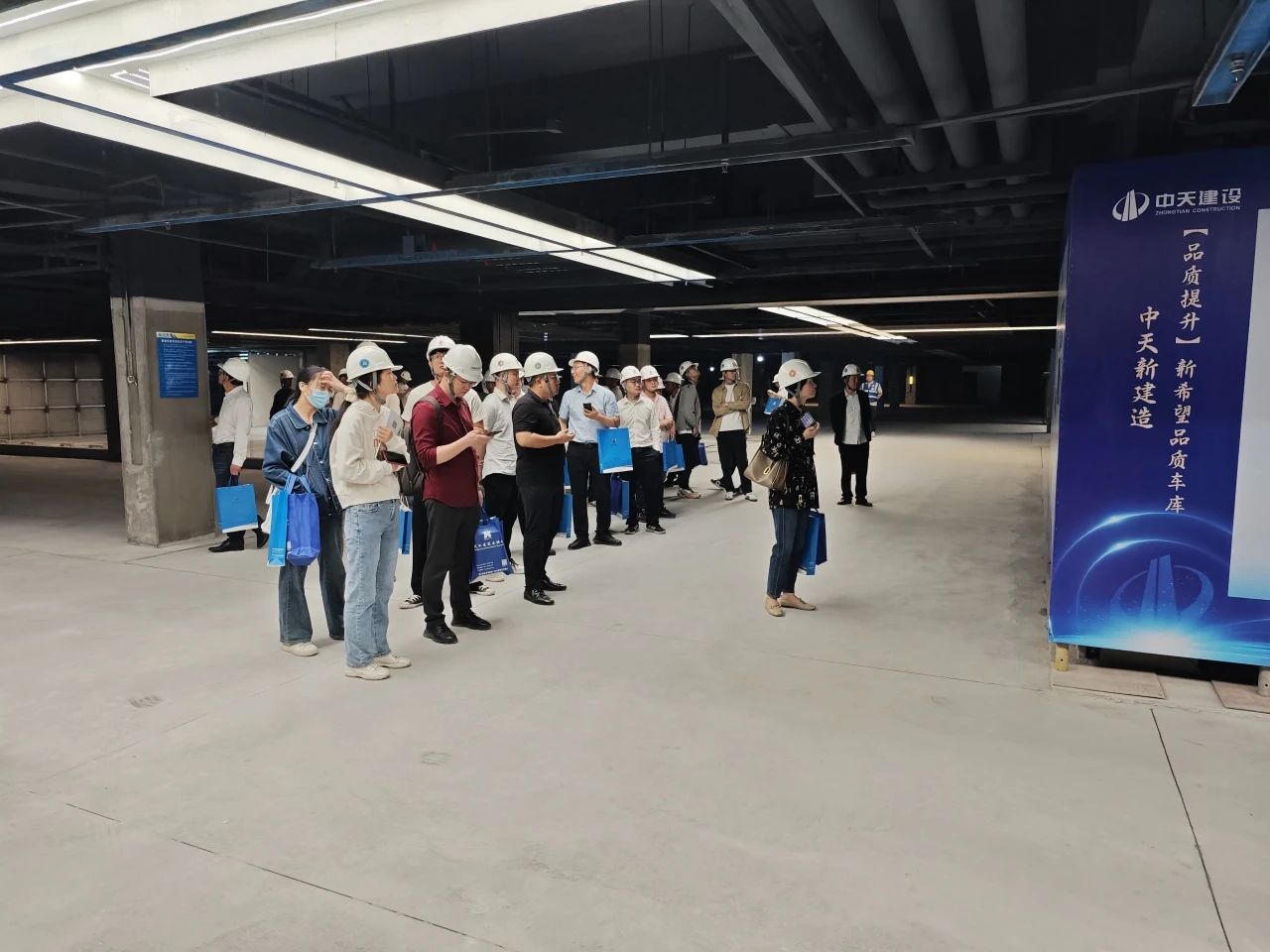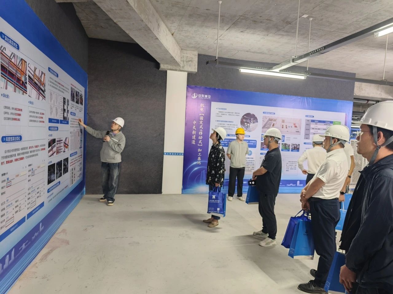 观摩现场重点展示了BIM技术深度应用,通过三维建模实现施工误差毫米级控制,并融合物联网实时监测数据,优化了基坑土方开挖与结构协同流程。施工团队还通过预制弧形钢结构与定制幕墙工艺,攻克了复杂空间结构难题,现场陈列的智能建造机器人和数字化管理平台,彰显了中天集团在“高、大、难”项目中的技术实力。