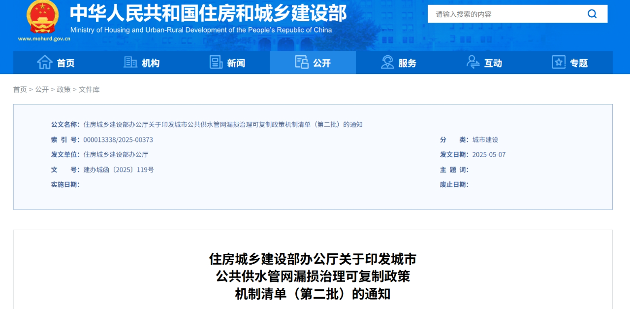 为加强城市公共供水管网漏损治理,健全长效机制,近日,住房城乡建设部、国家发展改革委遴选了50个城市和县城重点推进,梳理形成了城市公共供水管网漏损治理可复制政策机制清单(第二批)。