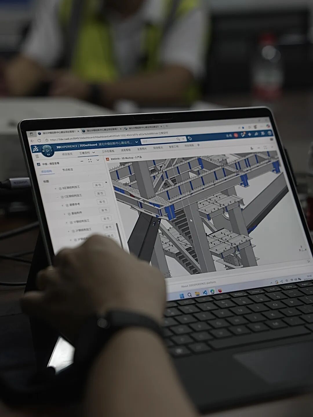 但现在,屏幕上的三维模型成了“数据枢纽”:设计师用它搭好建筑“骨架”,注明构件尺寸、三维定位及材料属性;钢结构加工厂打开模型,直接在上面进行钢构件加工深化,数据一键同步到加工机床;施工队到了现场,掏出平板或手机等终端设备调阅模型,螺栓型号、管线走向看得一清二楚。