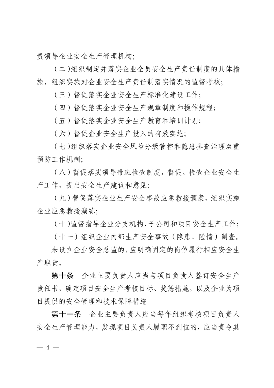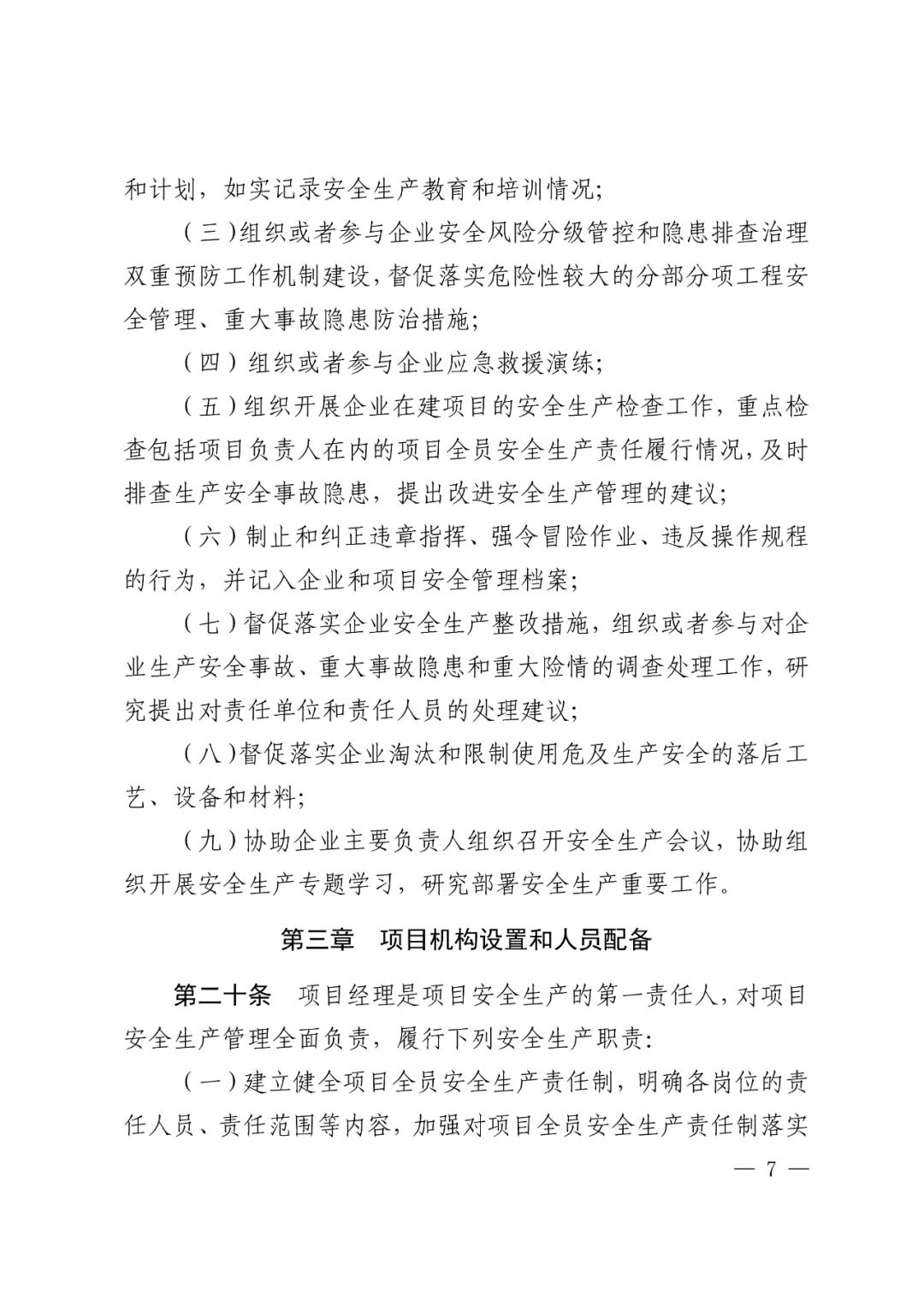第二十条 项目经理是项目安全生产的第一责任人,对项目 安全生产管理全面负责,履行9项安全生产职责(见正文部分)。