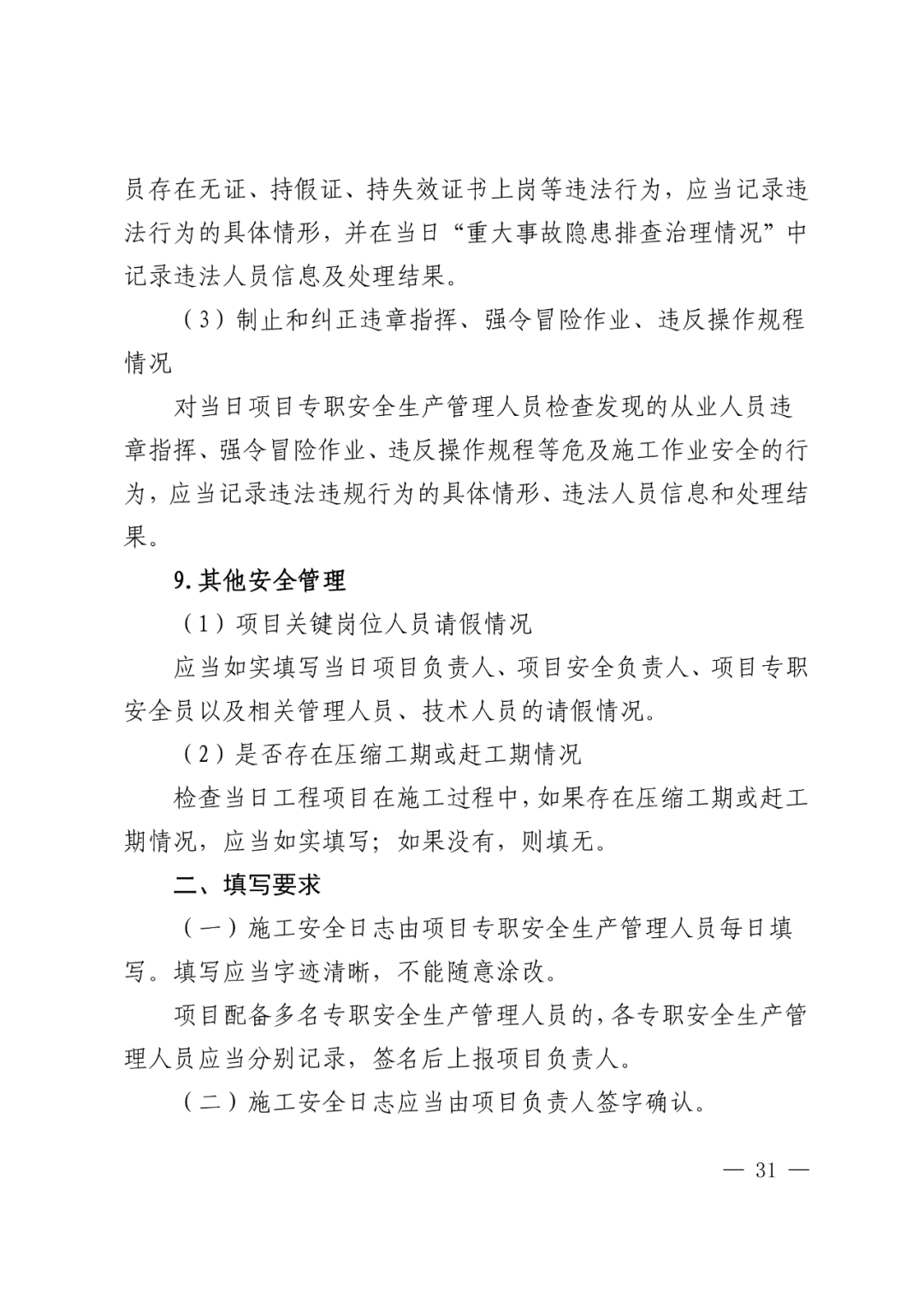 第三十四条 项目专职安全生产管理人员应当将每日安全检查和事故隐患处理情况及时填入施工安全日志(示范文本见附 件)。