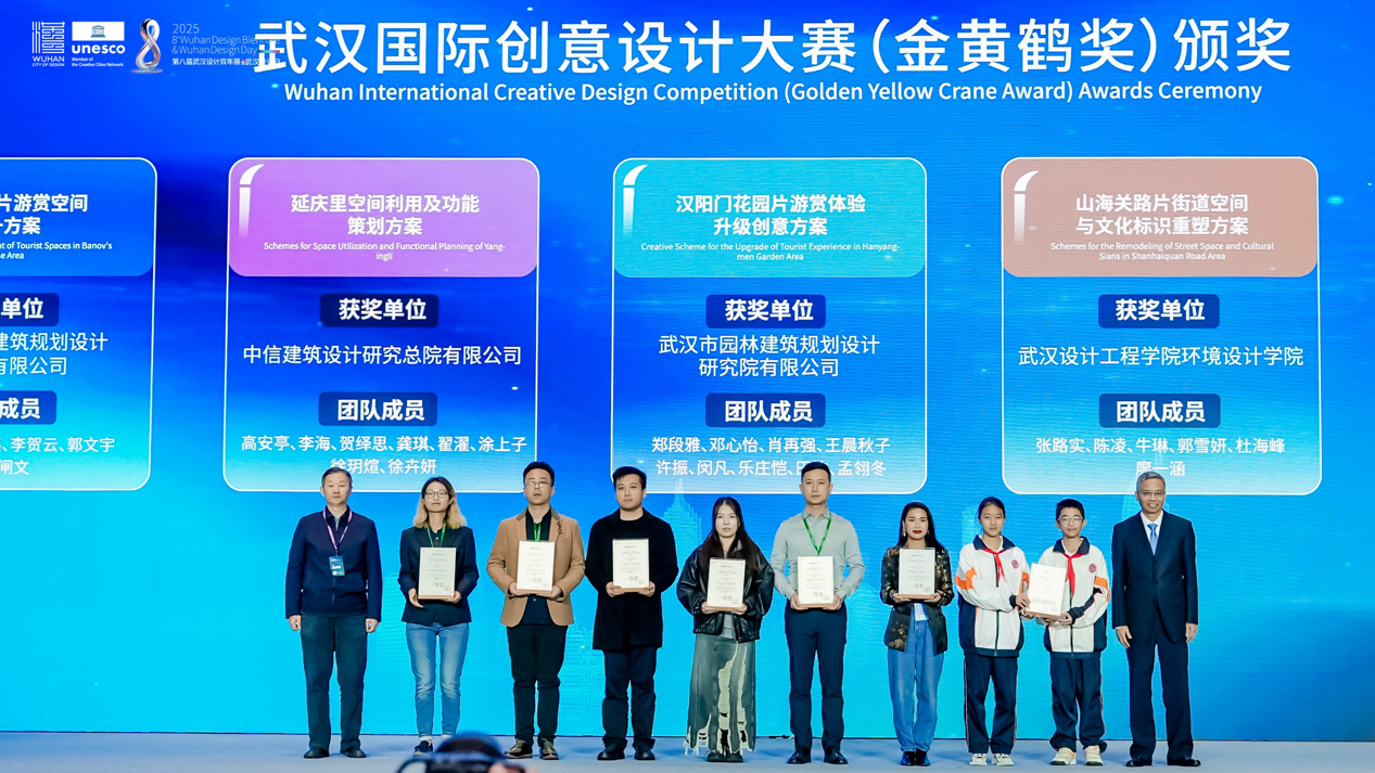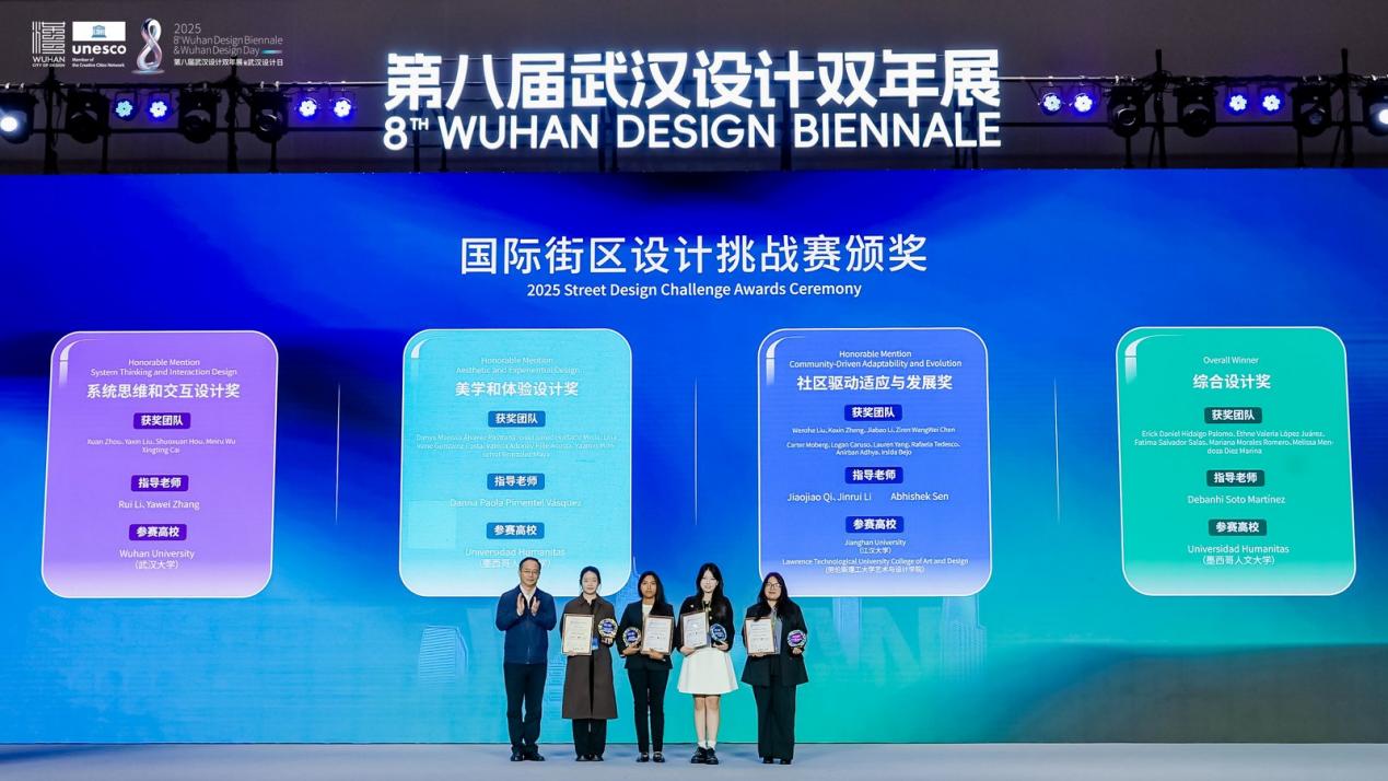 开幕式上,2025年武汉国际创意设计大赛(金黄鹤奖)与 2025年国际街区挑战赛颁奖仪式同步举行。其中,象征武汉设计创新探索的“金黄鹤奖”,今年特意选取黄鹤楼、山海关路、汉阳门等市民常去、关注度高、满满烟火气的城市地标作为设计对象,不限专业和地域,征集更宜人的更新提升方案。现场,武汉瑞拓建筑设计咨询有限公司等6个专业组一等奖和最佳组织奖武汉市七一华源中学等获奖代表接受颁奖。国际街区挑战赛,则是由联合国教科文组织设计之都城市联合举办,全球高校团队共同参与的国际设计赛事。经过全球30位权威专家1个月的精心细致评审,选出了四个优胜方案。现场,为交互设计奖获奖团队武汉大学、美学设计奖获奖团队墨西哥人文大学、社区发展奖获奖团队江汉大学团队和美国劳伦斯理工大学团队,以及综合设计奖获奖团队墨西哥人文大学颁奖。