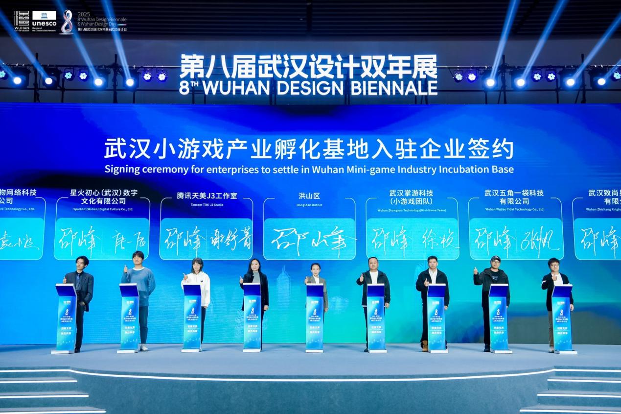荣誉之外,产业合作是设计价值转化的关键。开幕式现场,8家企业签约入驻全国首家小游戏产业孵化基地——“武汉市小游戏产业孵化基地”,他们中既有充满朝气的新生代小游戏团队,也有掌游科技这样的行业领军者,更有腾讯天美J3工作室等顶尖力量,他们将携手打破行业边界、共享资源平台,共同推动数字创意产业与设计融合发展。