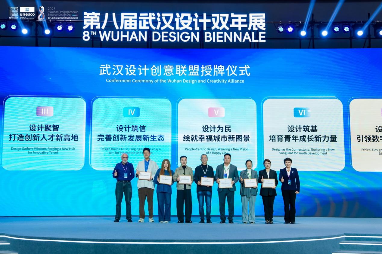 武汉有设计相关专业高校50余所,设计专业在校学生近10万人,设计相关企业突破1万家,10余个设计行业协会,从业人员超50万,形成了强大的“设计创意联盟”,催生出了集产业链、创新链、人才链、价值链于一体的融合创新发展生态体系。在开幕式的最后,“武汉设计创意联盟”正式授牌,来自设计企业、行业协会、高校院所和独立设计师等领域多元设计力量代表共同见证。未来,“武汉设计创意联盟”将奋力实现设计融城,构筑协同发展新范式;设计赋能,激活产业升级新动能;设计聚智,打造创新人才新高地;设计筑信,完善创新发展新生态;设计为民,绘就幸福城市新图景;设计筑基,培育青年成长新力量;设计向善,引领数字文明新航向;设计联通,拓展国际交往新空间八大目标。