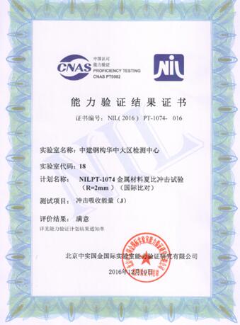 本网讯(通讯员 杨杰)日前,从北京中实国金国际实验室能力验证研究院获悉,在2016年举办的全国实验室检测能力验证活动中,中建钢构华中大区检测中心参加的“金属材料夏比冲击试验”(国际比对)能力验证,获得满意证书,验证成绩优秀。标志着中建钢构华中大区“金属材料夏比冲击试验”方法科学,测量准确水平达到国内先进。