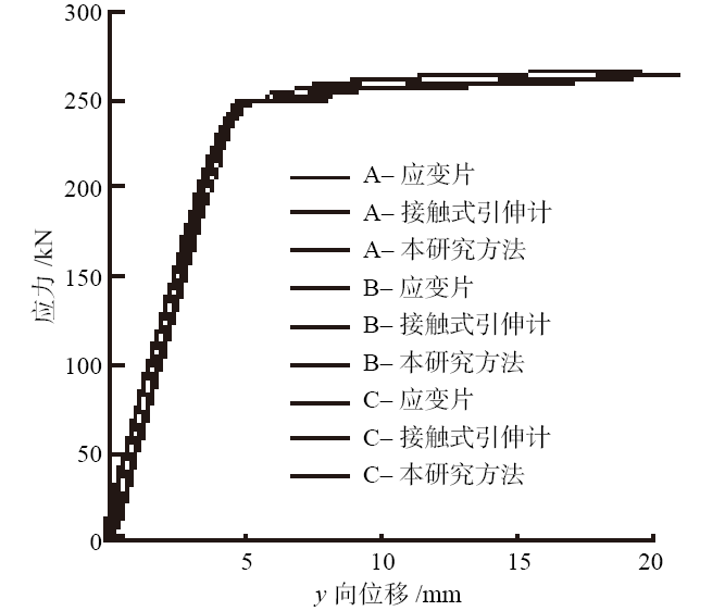 对于500 mm均匀截面钢绞线在y方向的伸长率测量,本研究提出的方法与应变片、接触式引伸计的测量结果之间的相对误差较小。这一结果充分验证了本研究方法的准确性和有效性。然而,考虑到引伸计需要在安全时间内拆除,且在试验后期采用了横梁位移来记录伸长量,在拉伸过程中,钢绞线两端可能会出现局部紧缩现象,导致计算区域并非中部均匀变形段。